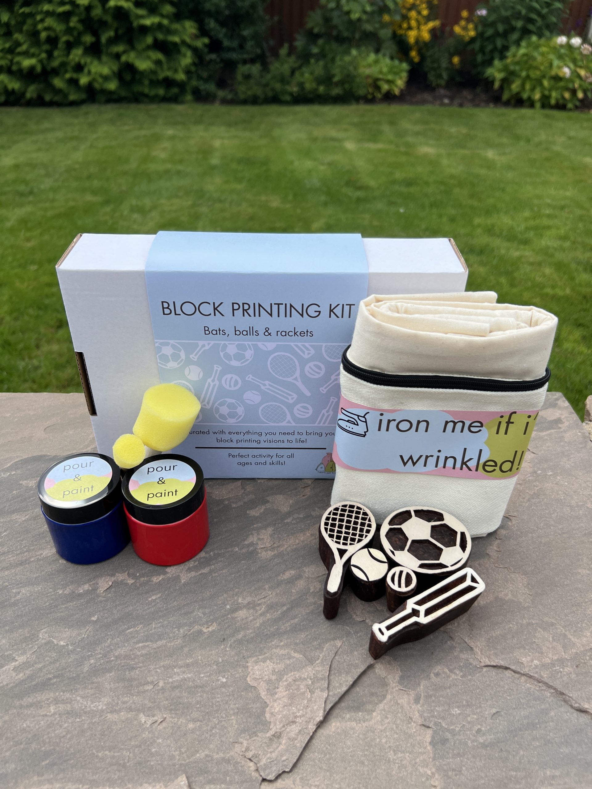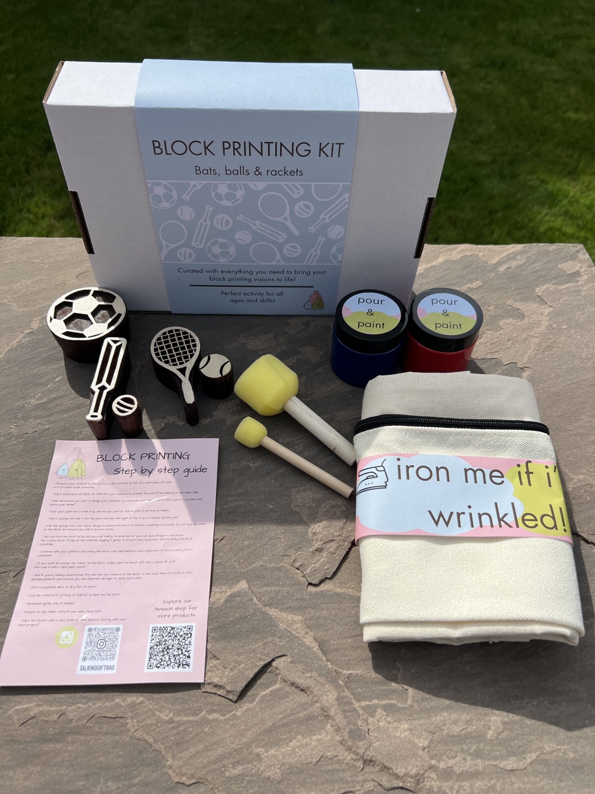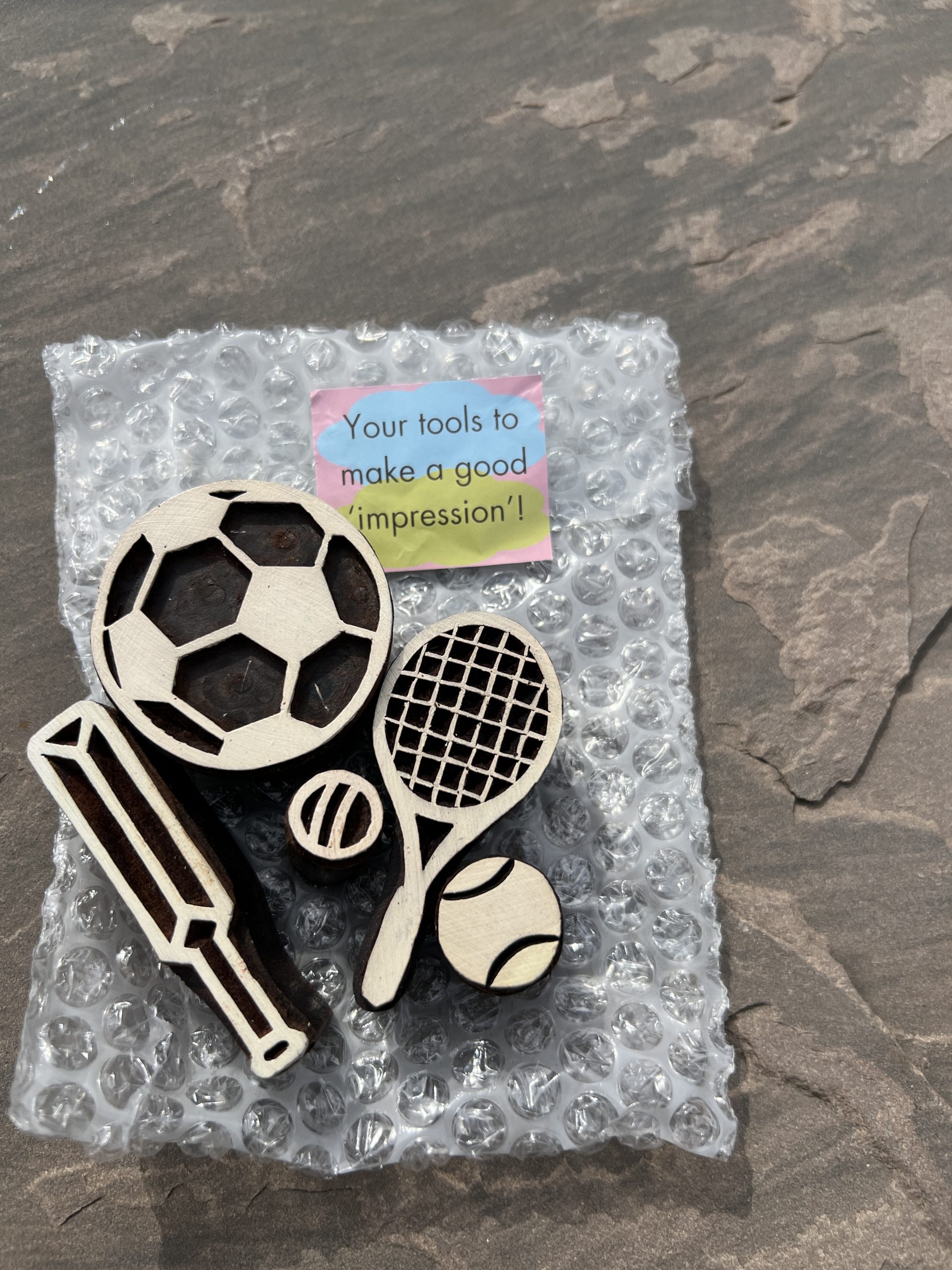 – Wooden printing blocks x 3 designs (Bat, Balls and Rackets)